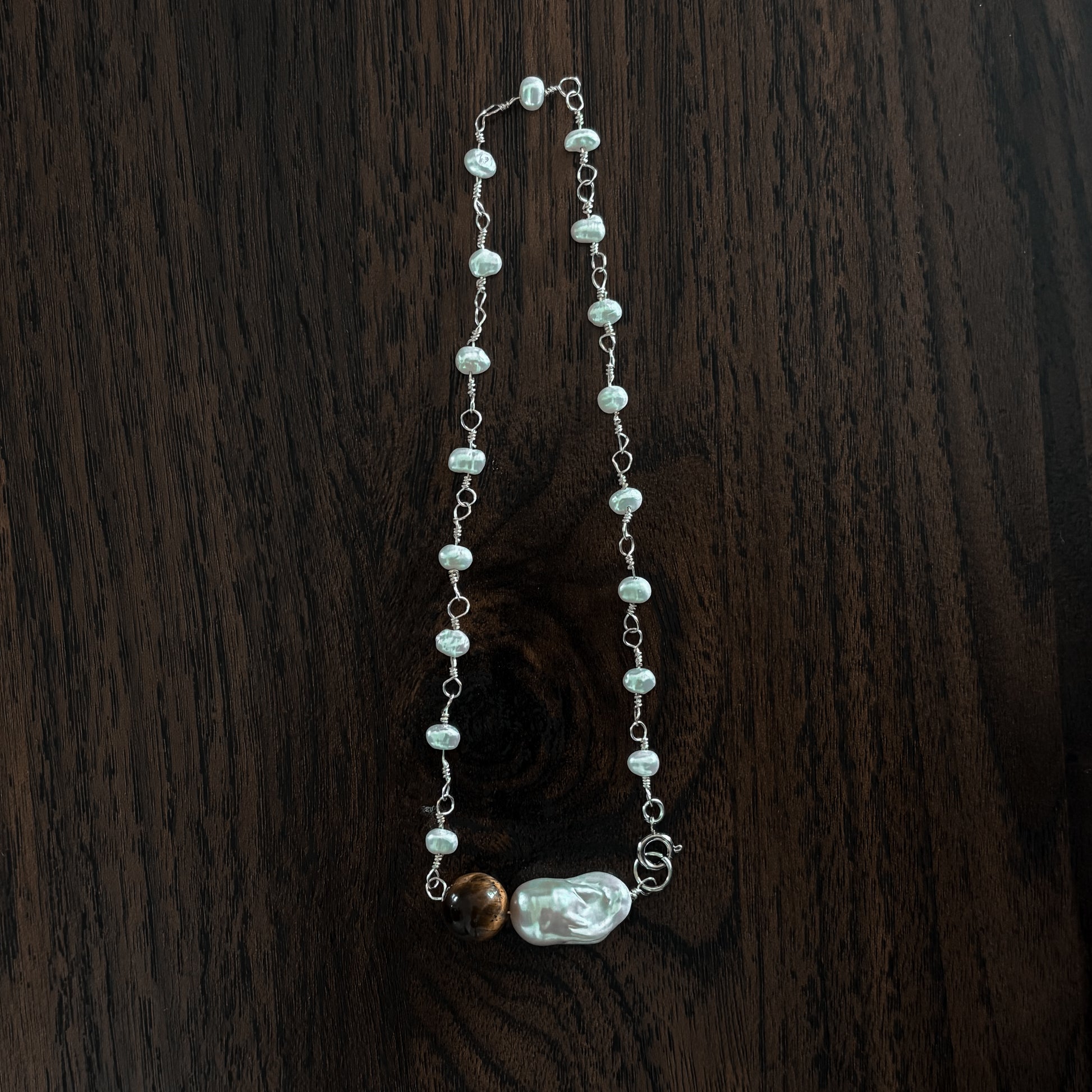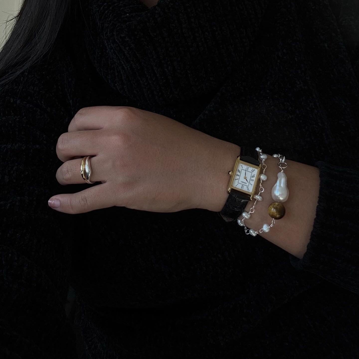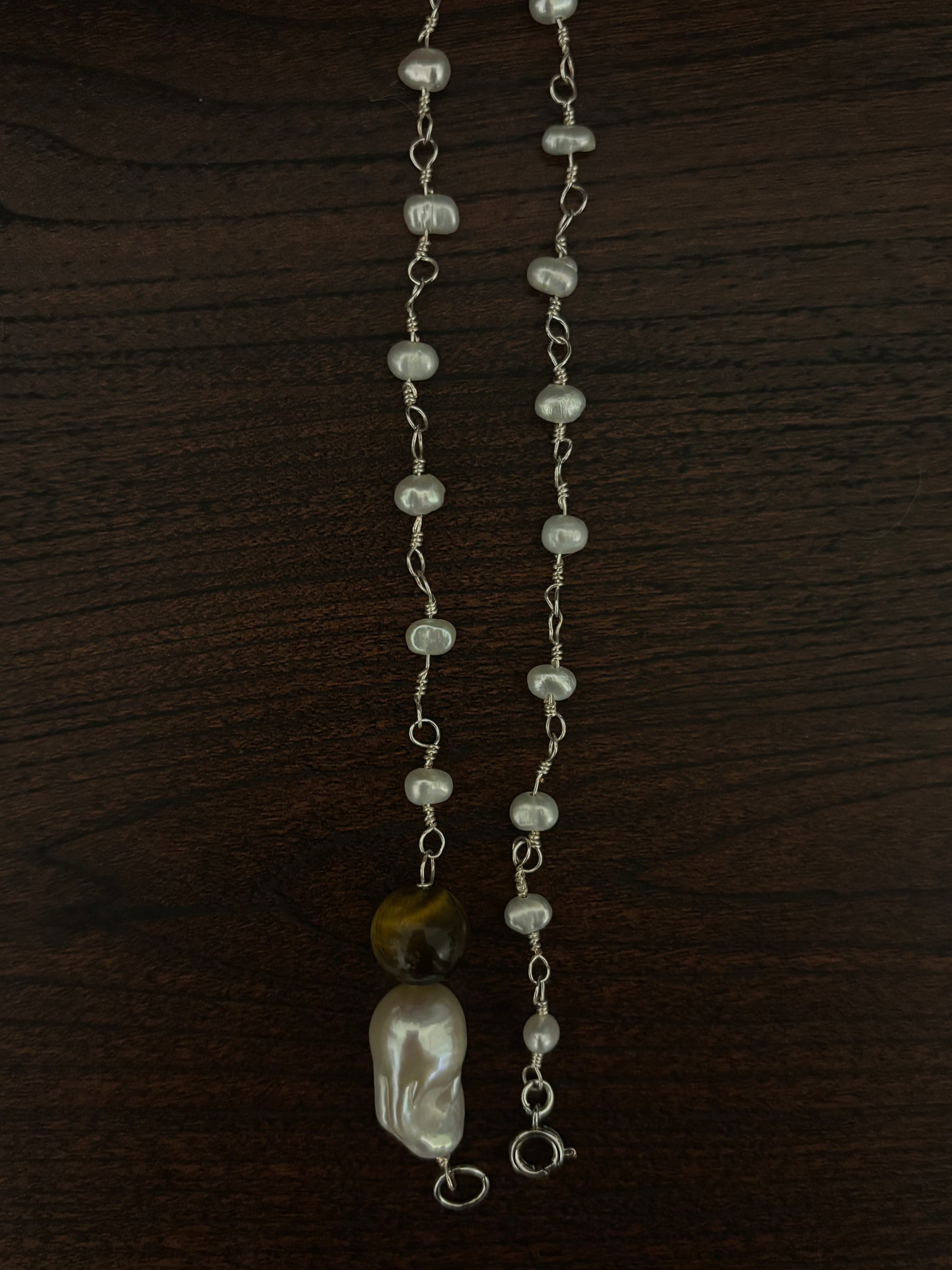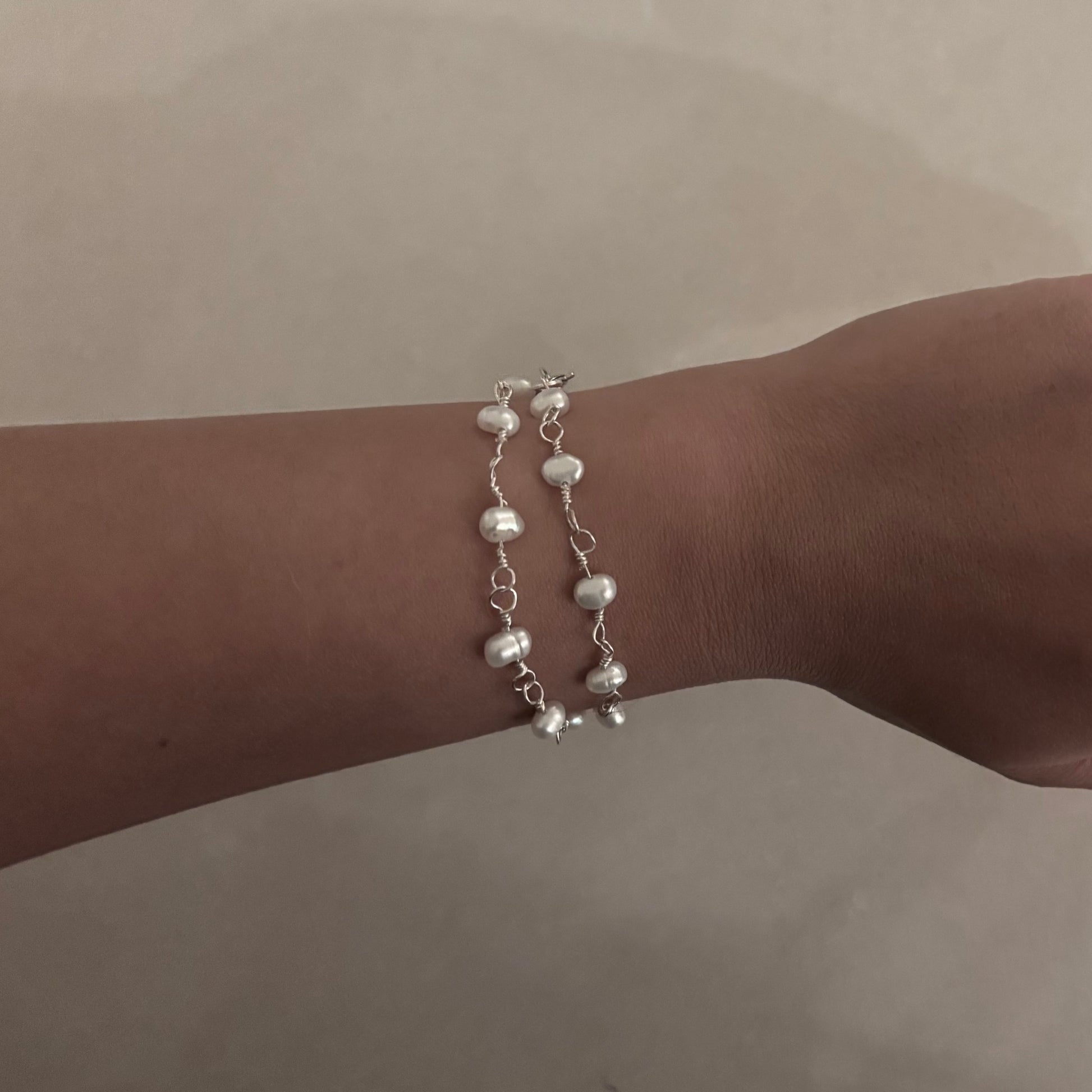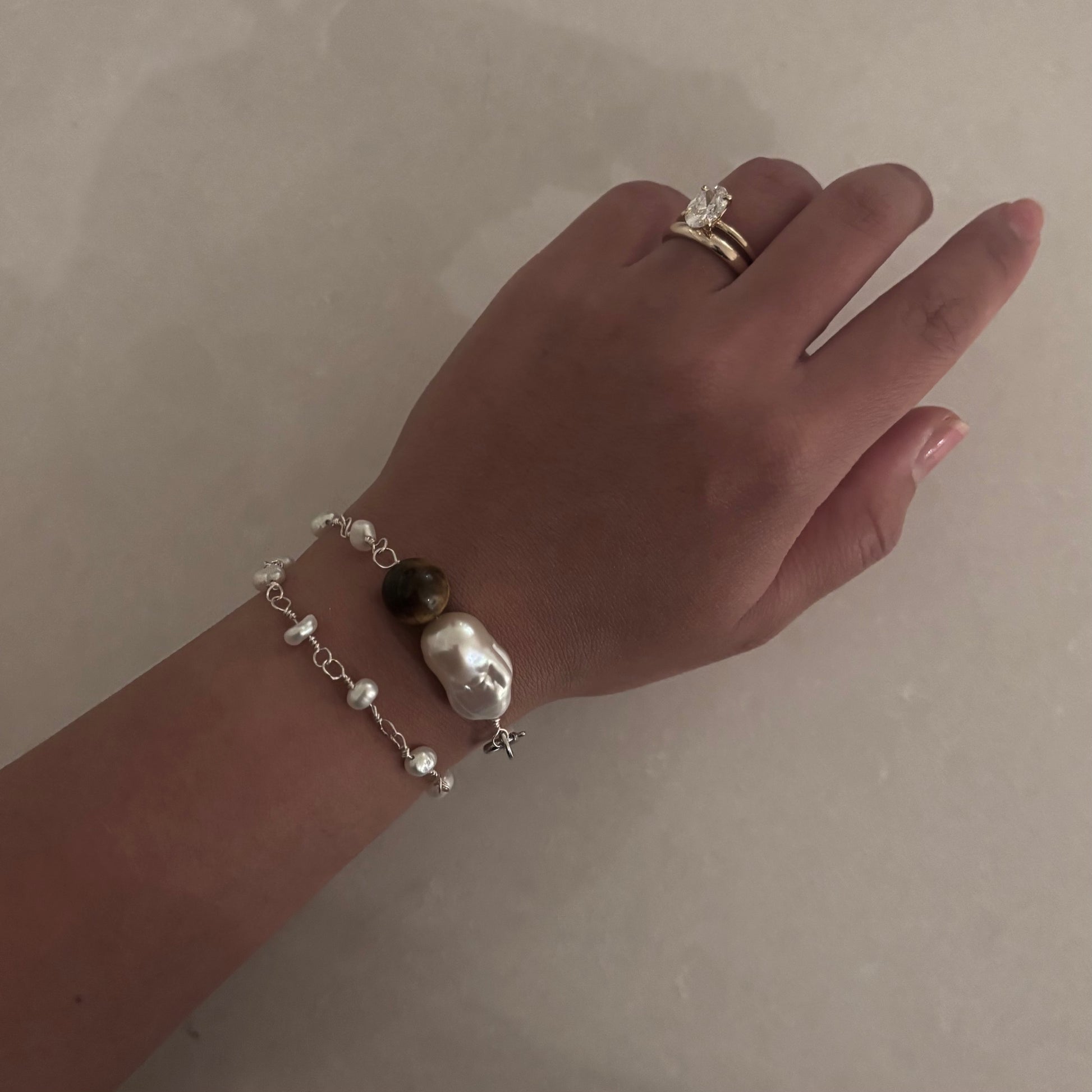 - Mini baroque pearls set in hypoallergenic silver, accented by a single colored gemstone and a larger baroque pearl as the focal points. Designed to be double wrapped around the wrist for a layered look.