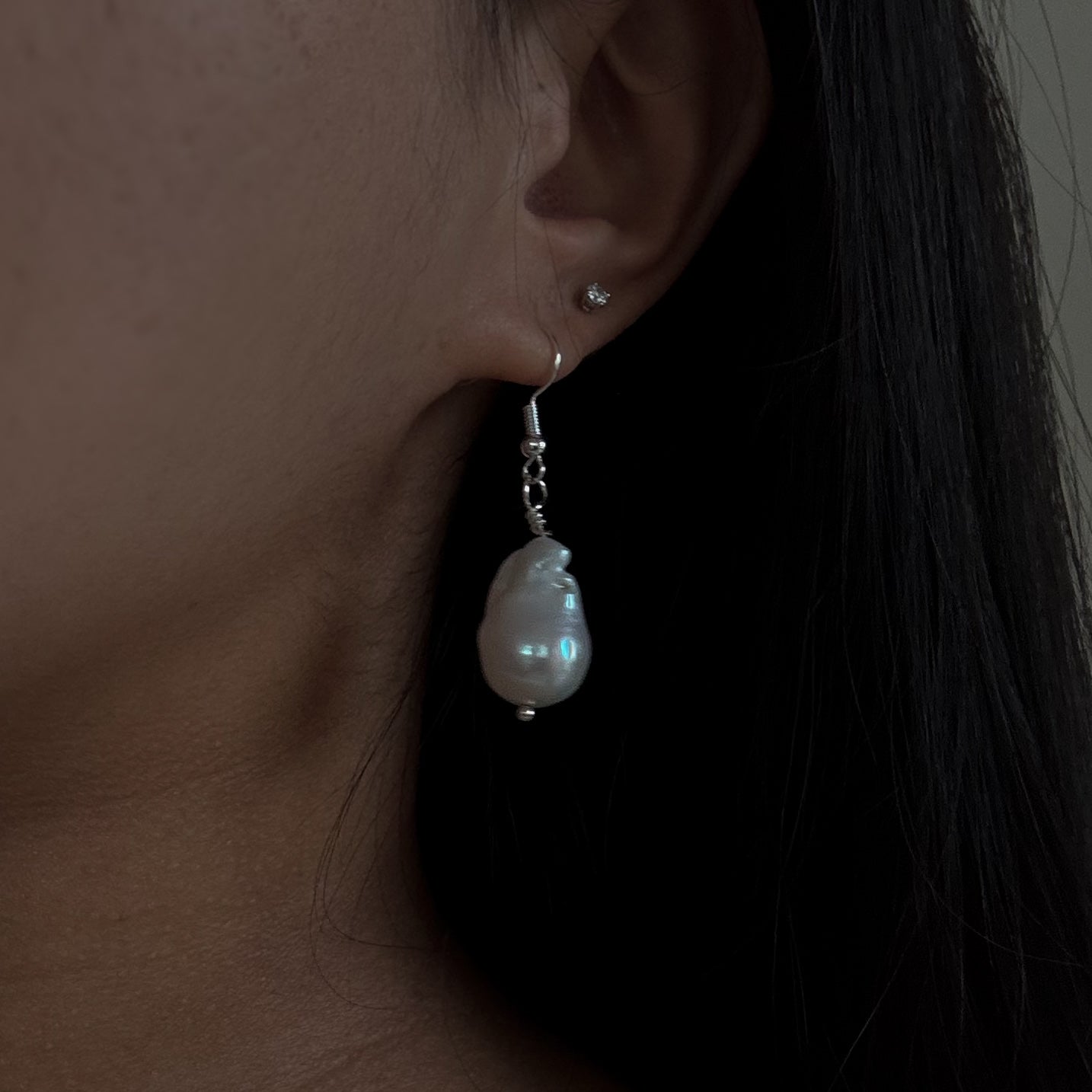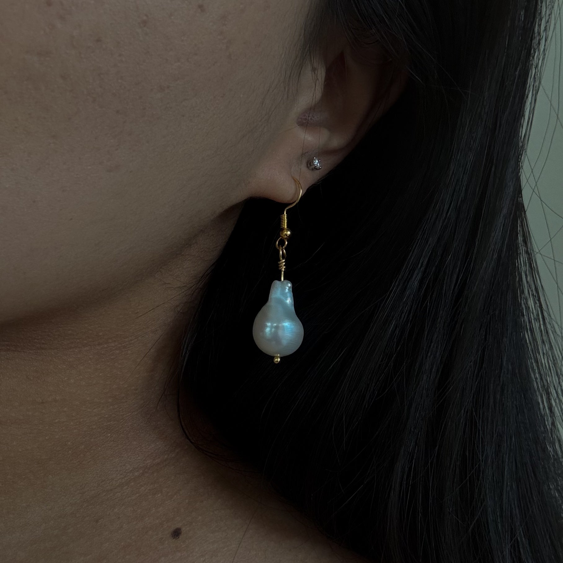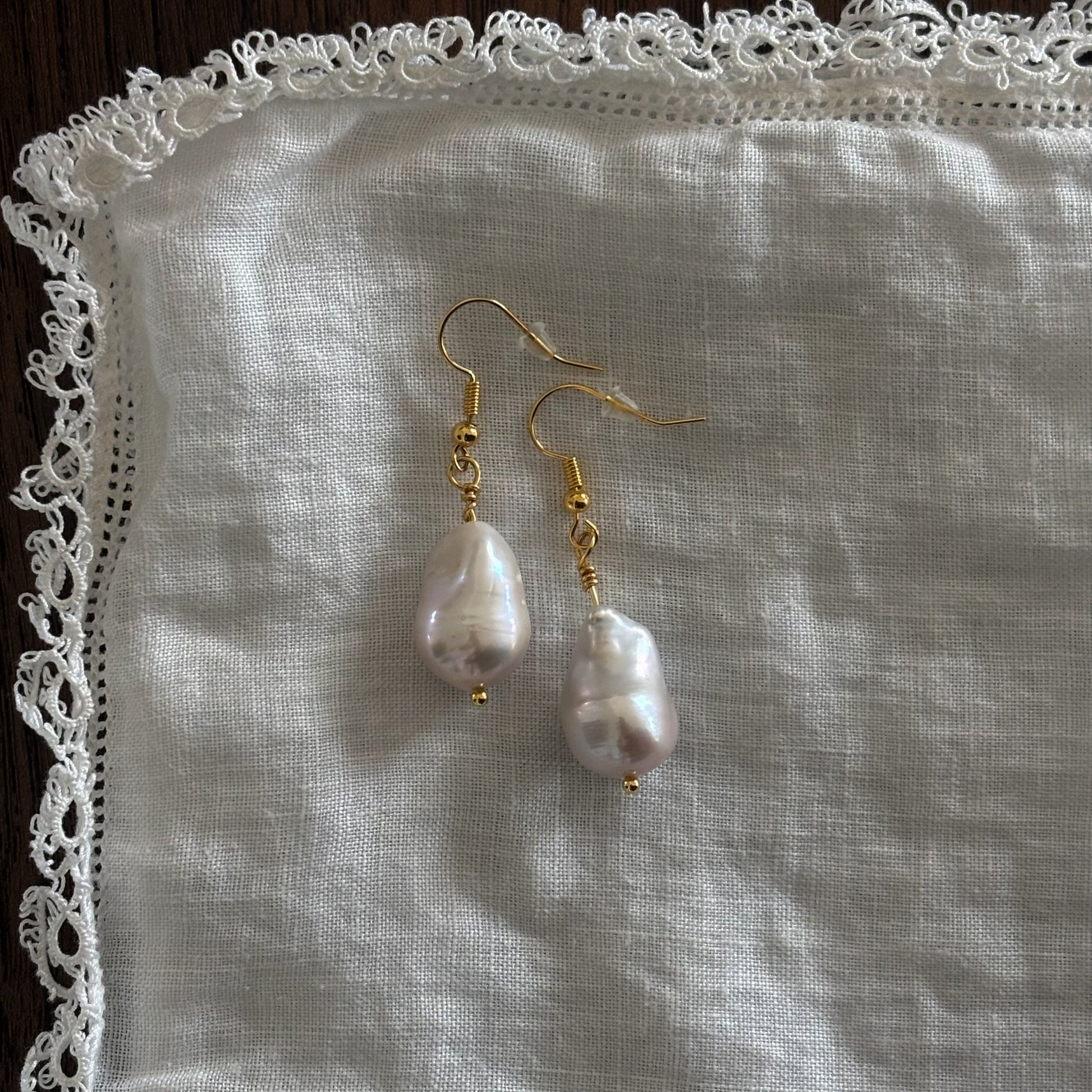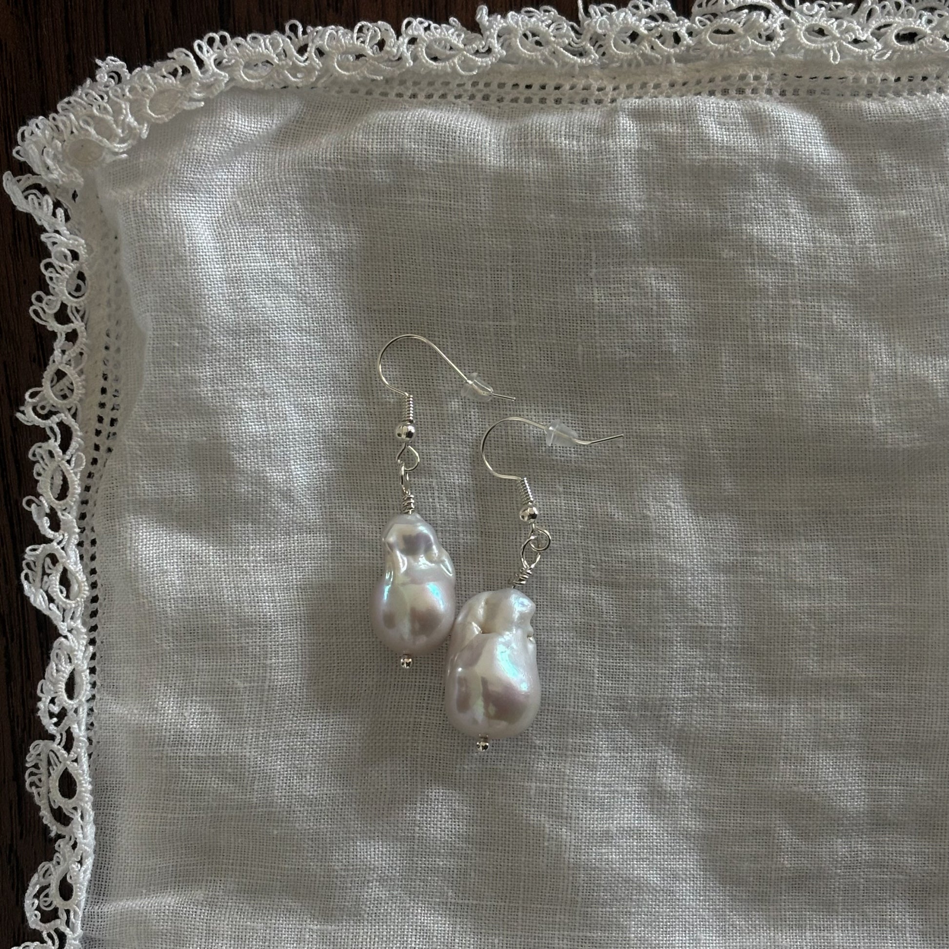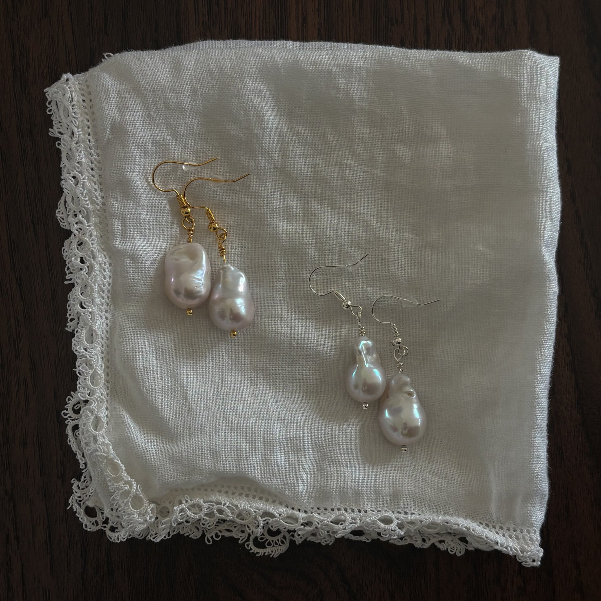 - Large, freshwater baroque pearls set in hypoallergenic silver or gold-plated metal.
