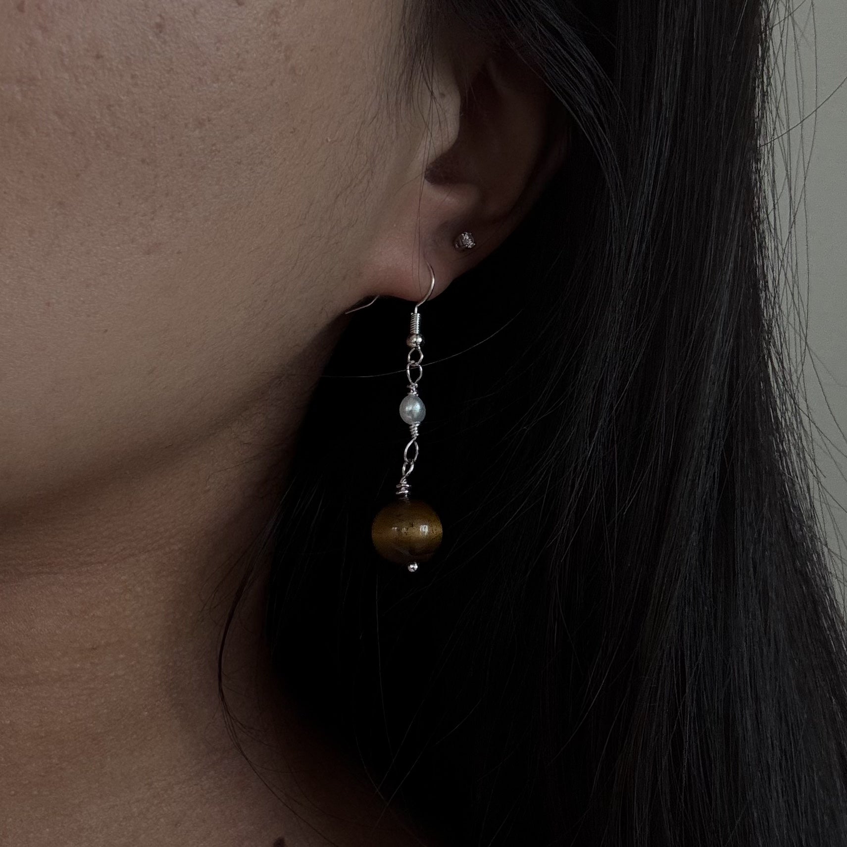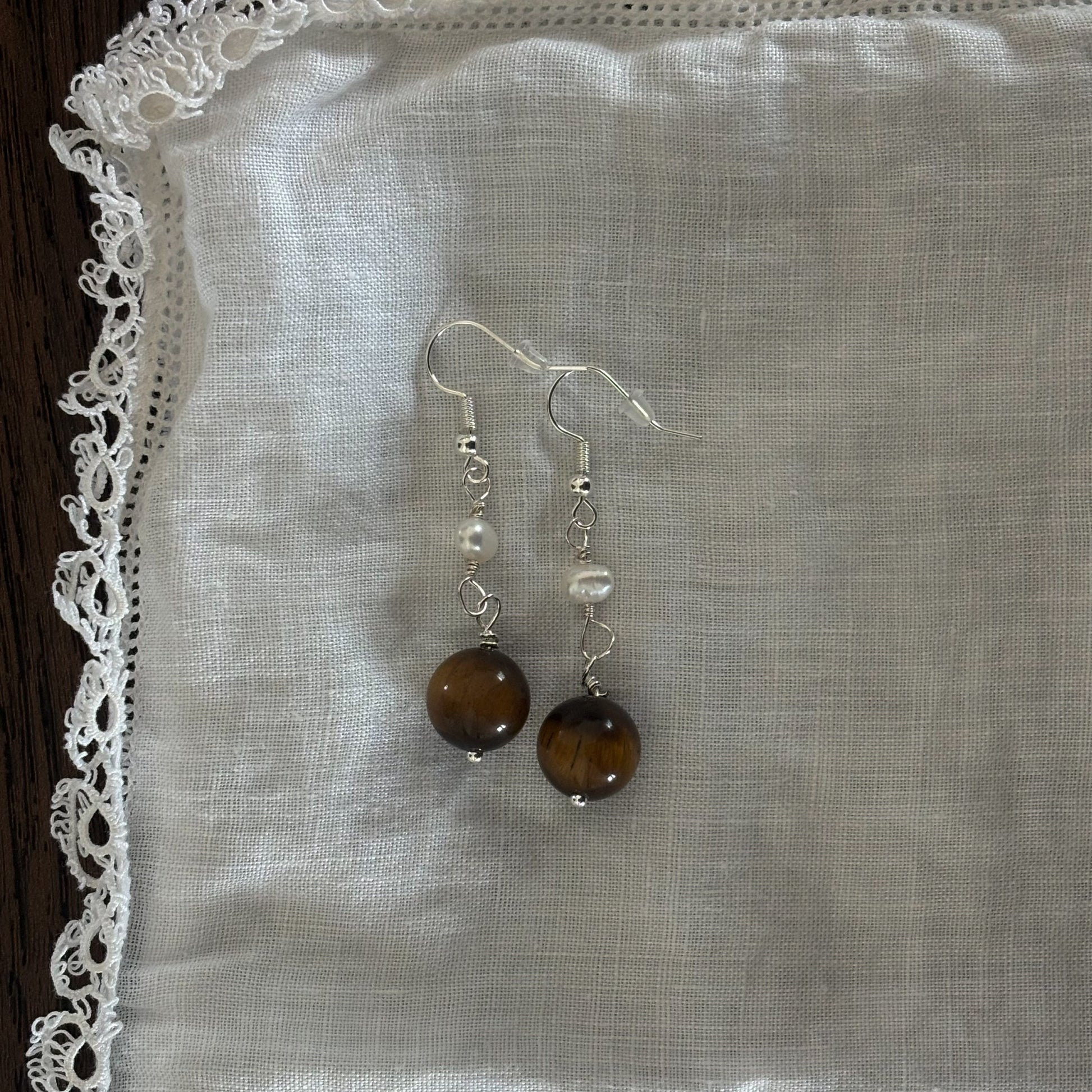 - Baroque pearl and tiger's eye set in hypoallergenic silver metal.